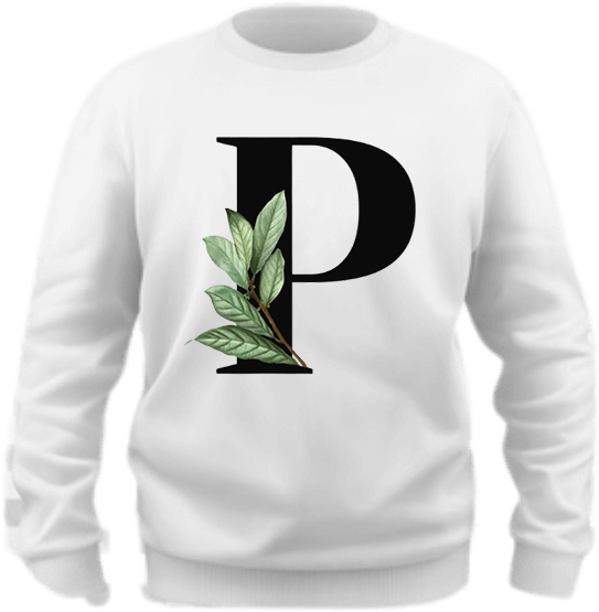 This white sweatshirt features a minimalist yet sophisticated design with a bold black “P” adorned by delicate green leaves.